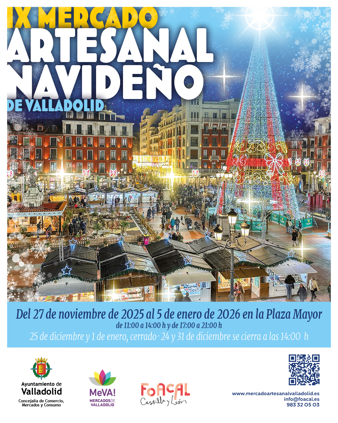 El Mercado Artesanal Navideño de Valladolid vuelve a la Plaza Mayor con su edición más grande hasta la fecha: 70 puestos de artesanía y alimentación hechos a mano para comprar local y encontrar regalos únicos. Se celebra del 27 de noviembre de 2025 al 5 de enero de 2026, con horario de 11:00 a 14:00 y de 17:00 a 21:00 h (cierra el 25 de diciembre y 1 de enero; 24 y 31 solo abre por la mañana).