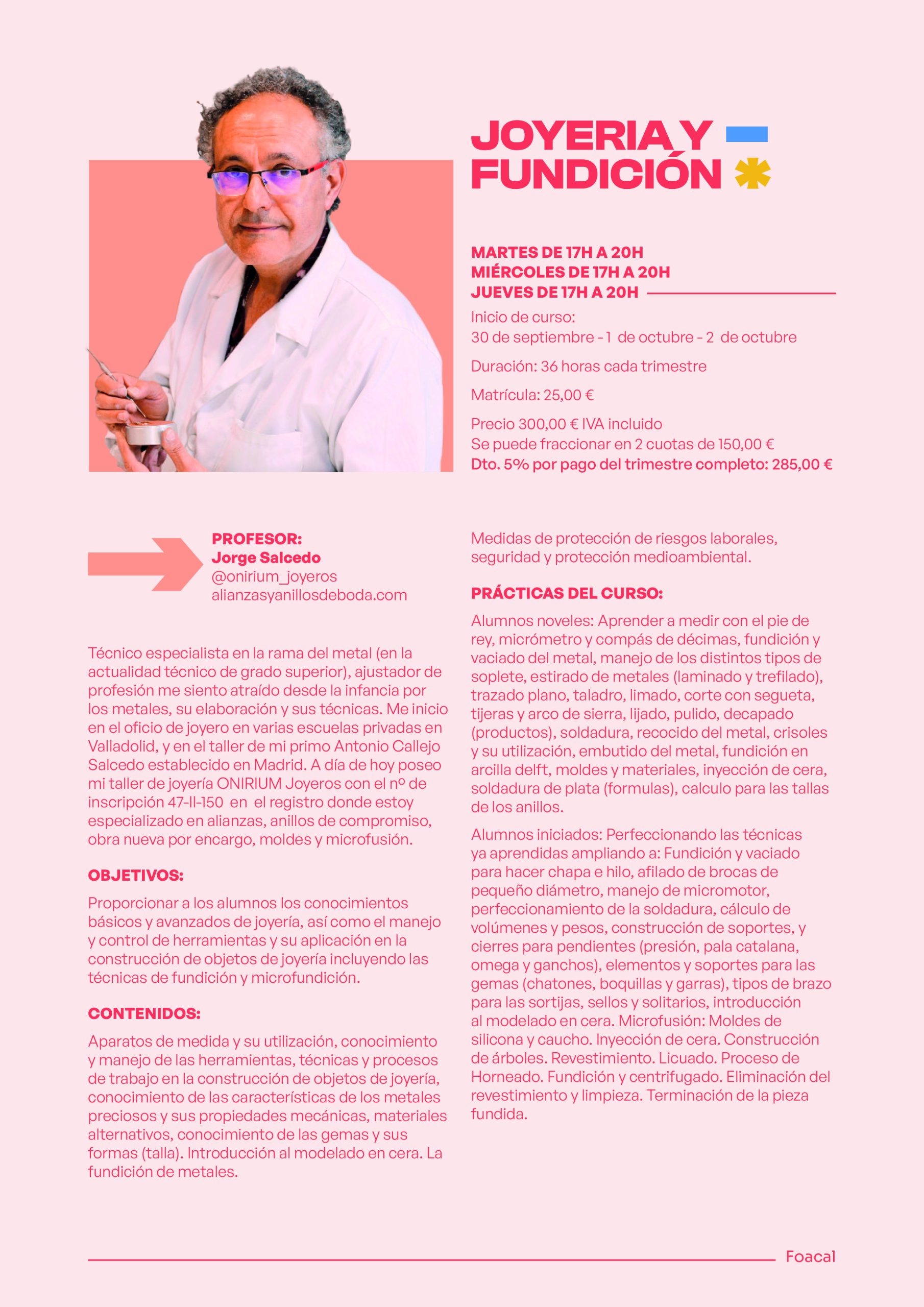 Alumnos noveles: Aprender a medir con el pie de rey, micrómetro y compás de décimas, fundición y vaciado del metal, manejo de los distintos tipos de soplete, estirado de metales (laminado y trefilado), trazado plano, taladro, limado, corte con segueta, tijeras y arco de sierra, lijado, pulido, decapado (productos), soldadura, recocido del metal, crisoles y su utilización, embutido del metal, fundición en arcilla delft, moldes y materiales, inyección de cera, soldadura de plata (fórmulas), cálculo para las tallas de los anillos.