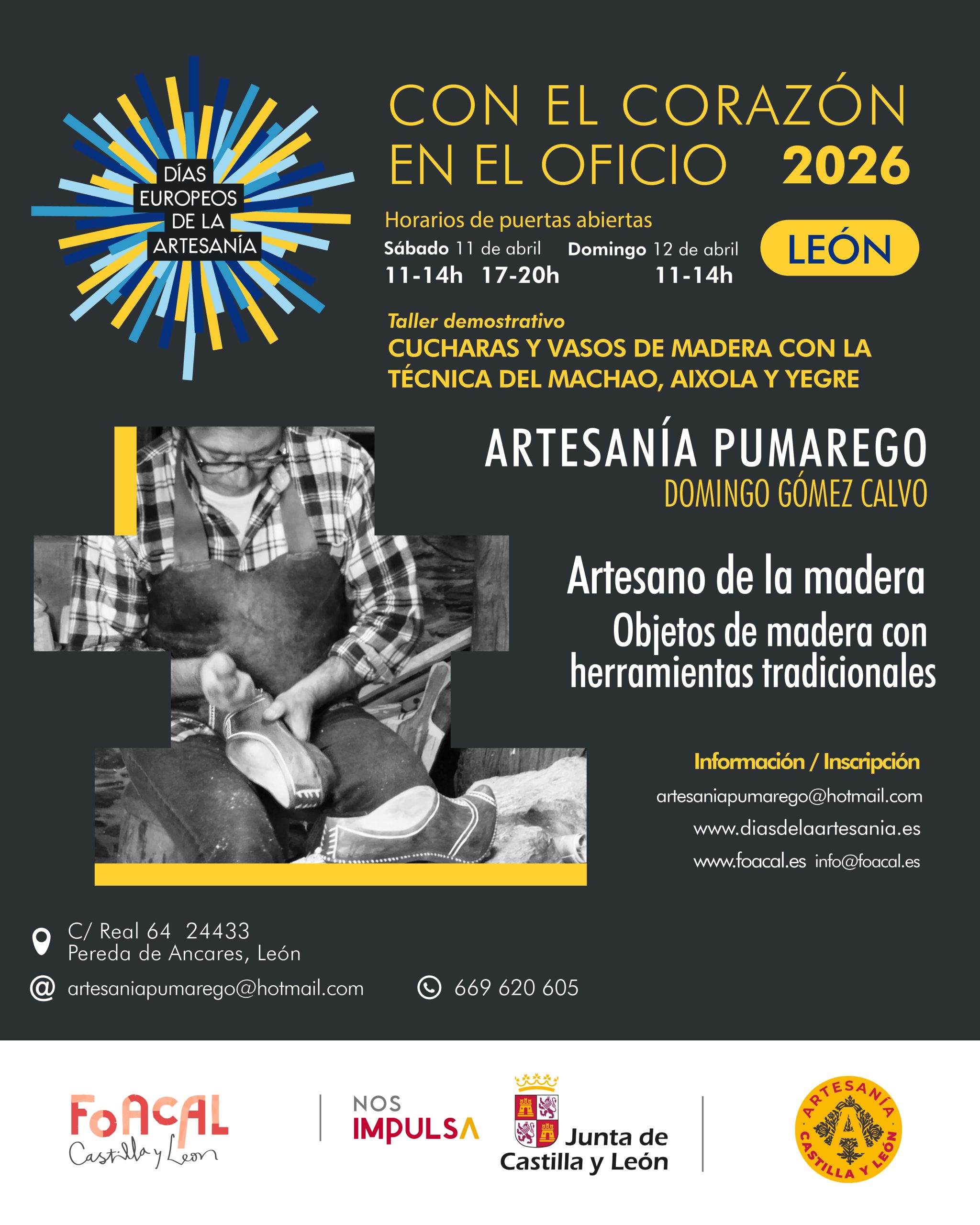 La Federación de Organizaciones Artesanas de Castilla y León (FOACAL), con el apoyo y financiación de la Junta de Castilla y León, promueve una nueva edición de los Días Europeos de la Artesanía en la provincia de León con la participación de tres talleres artesanos que abrirán sus puertas al público el sábado 11 y el domingo 12 de abril. La programación se enmarca en el lema «Con el corazón en el oficio» y permitirá acercarse al trabajo real de los oficios en distintos puntos del territorio leonés.