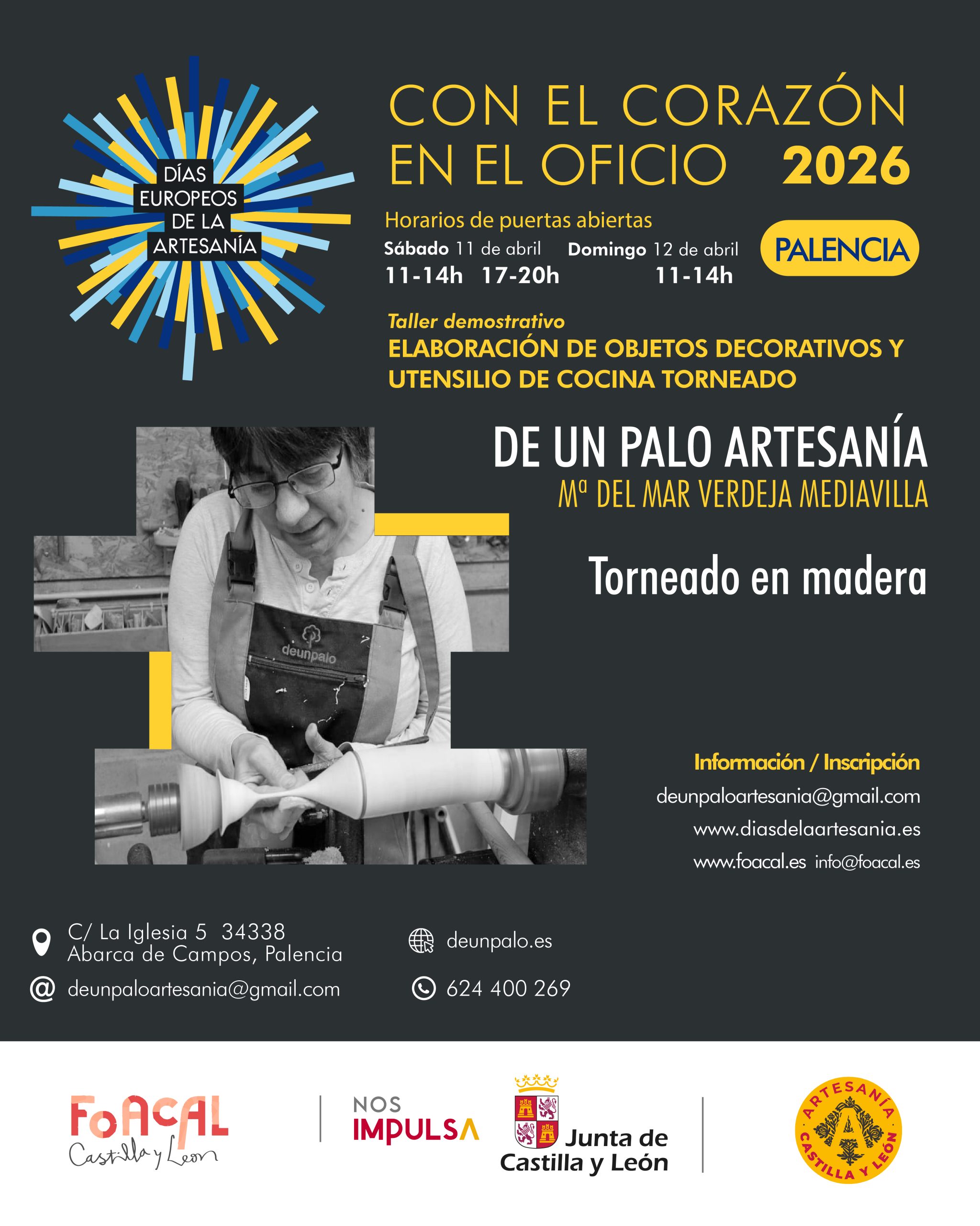 En Abarca de Campos, el taller De un Palo Artesanía, dirigido por M.ª del Mar Verdeja Mediavilla, desarrollará una actividad demostrativa centrada en la elaboración de objetos decorativos y utensilios de cocina torneados en madera, mostrando de cerca el trabajo artesanal con torno aplicado a piezas de uso cotidiano. Las personas interesadas pueden reservar plaza en el 624 400 269.