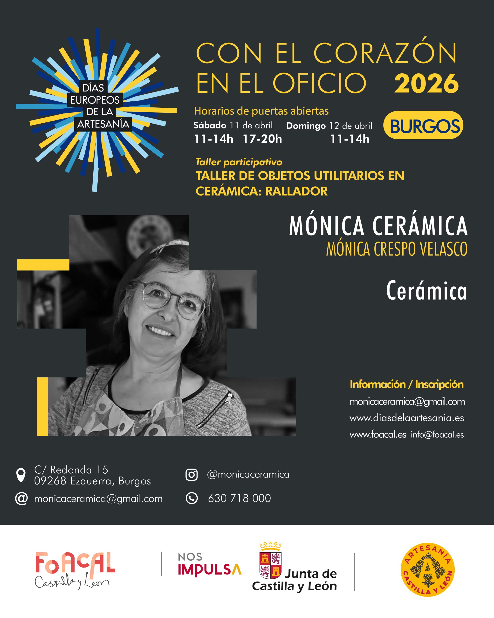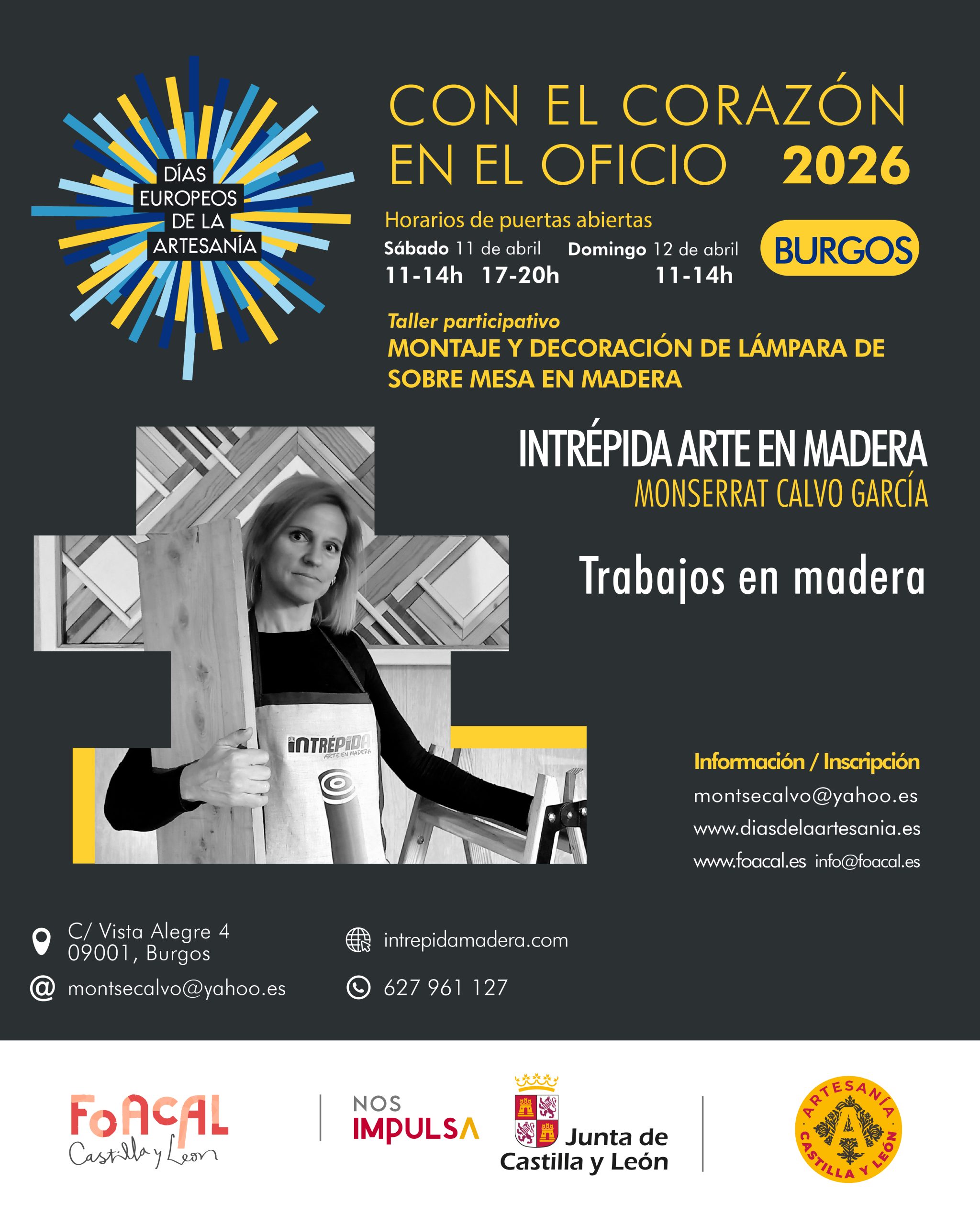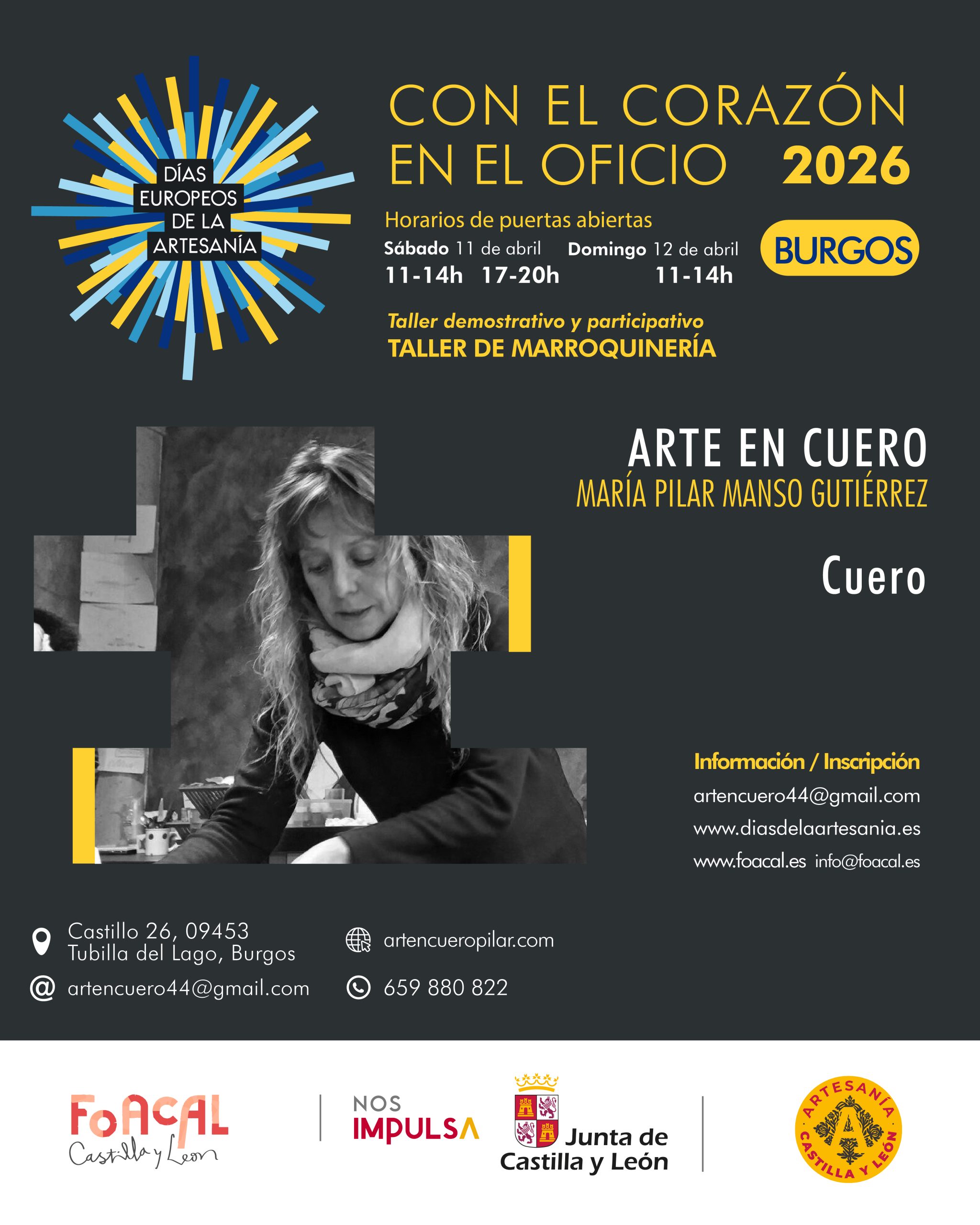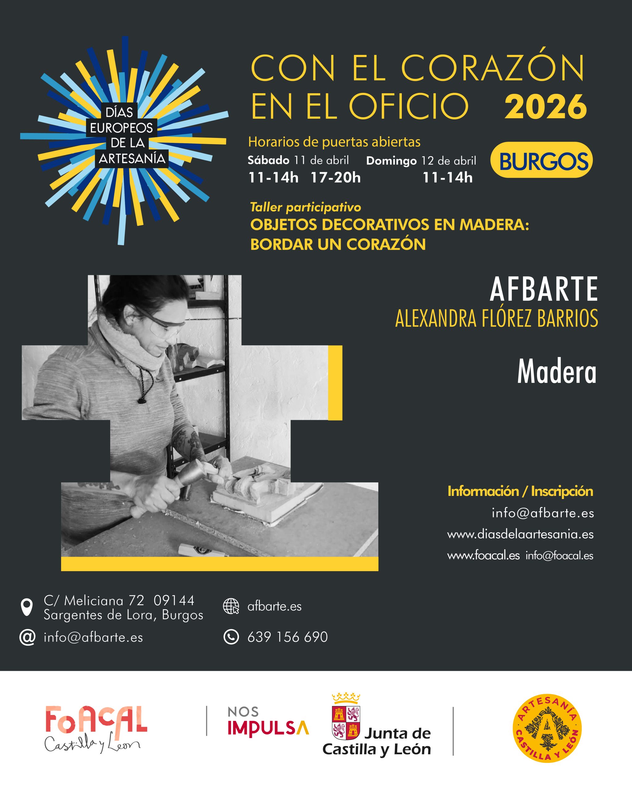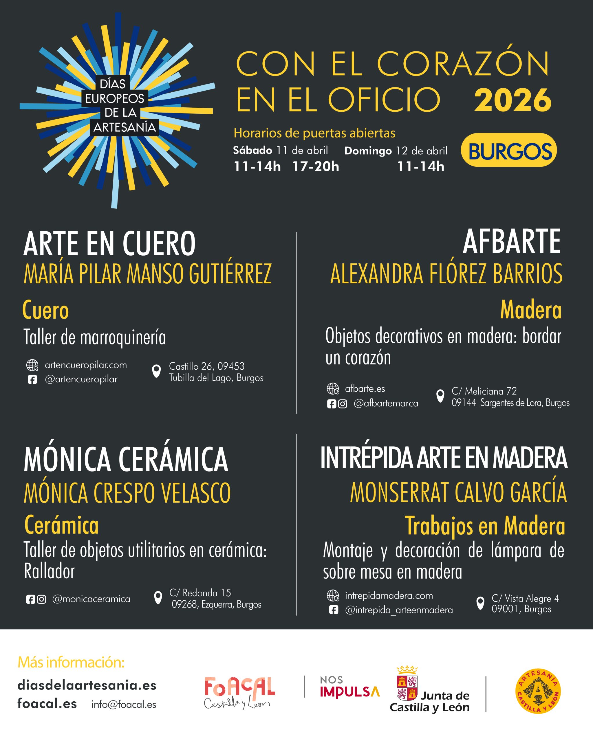 La Federación de Organizaciones Artesanas de Castilla y León (FOACAL), con el apoyo y financiación de la Junta de Castilla y León, promueve una nueva edición de los Días Europeos de la Artesanía en la provincia de Burgos con cuatro talleres artesanos que abrirán sus puertas al público el sábado 11 y el domingo 12 de abril. La programación se enmarca en el lema «Con el corazón en el oficio» y permitirá acercarse al trabajo real de los oficios en distintos puntos del territorio burgalés.