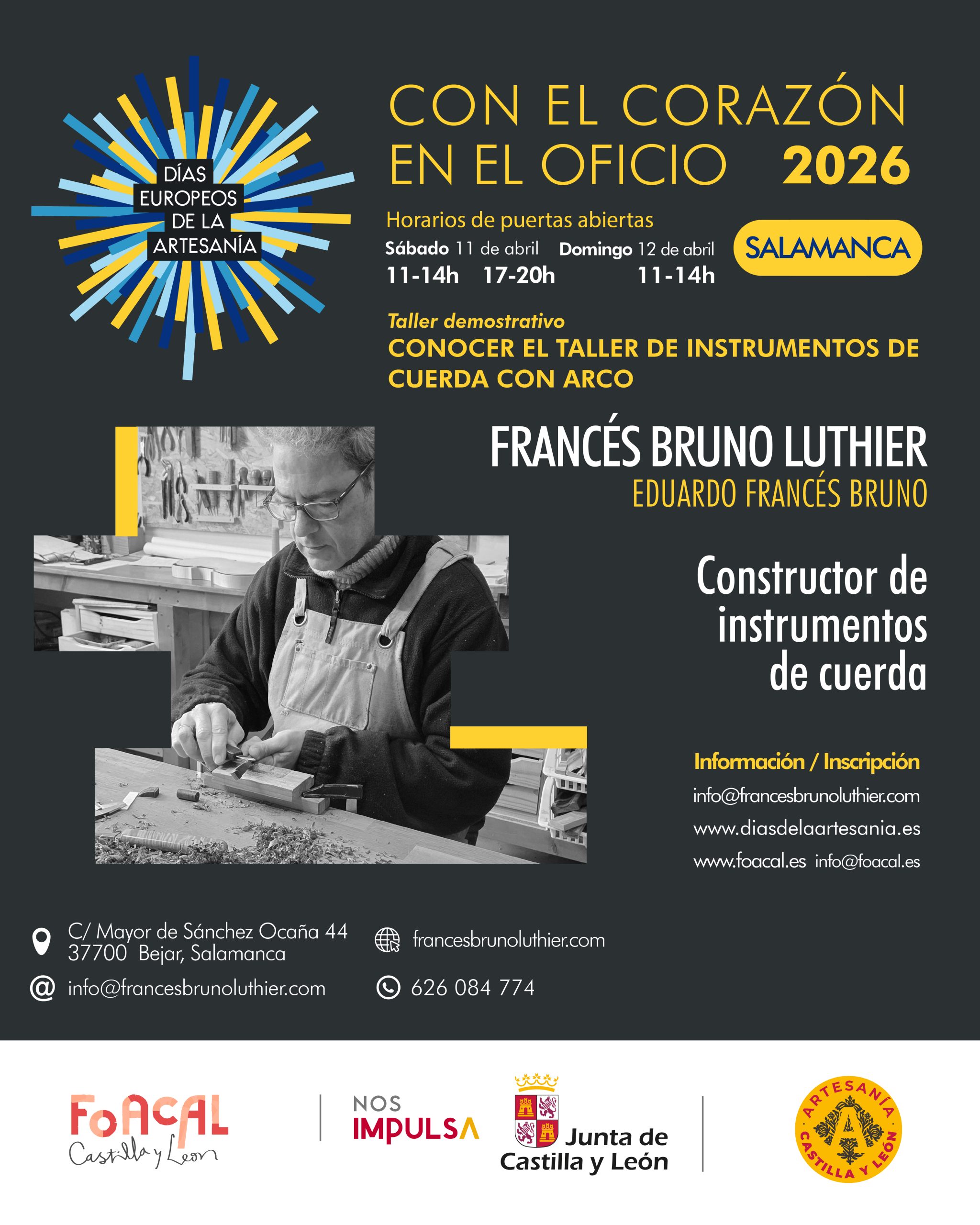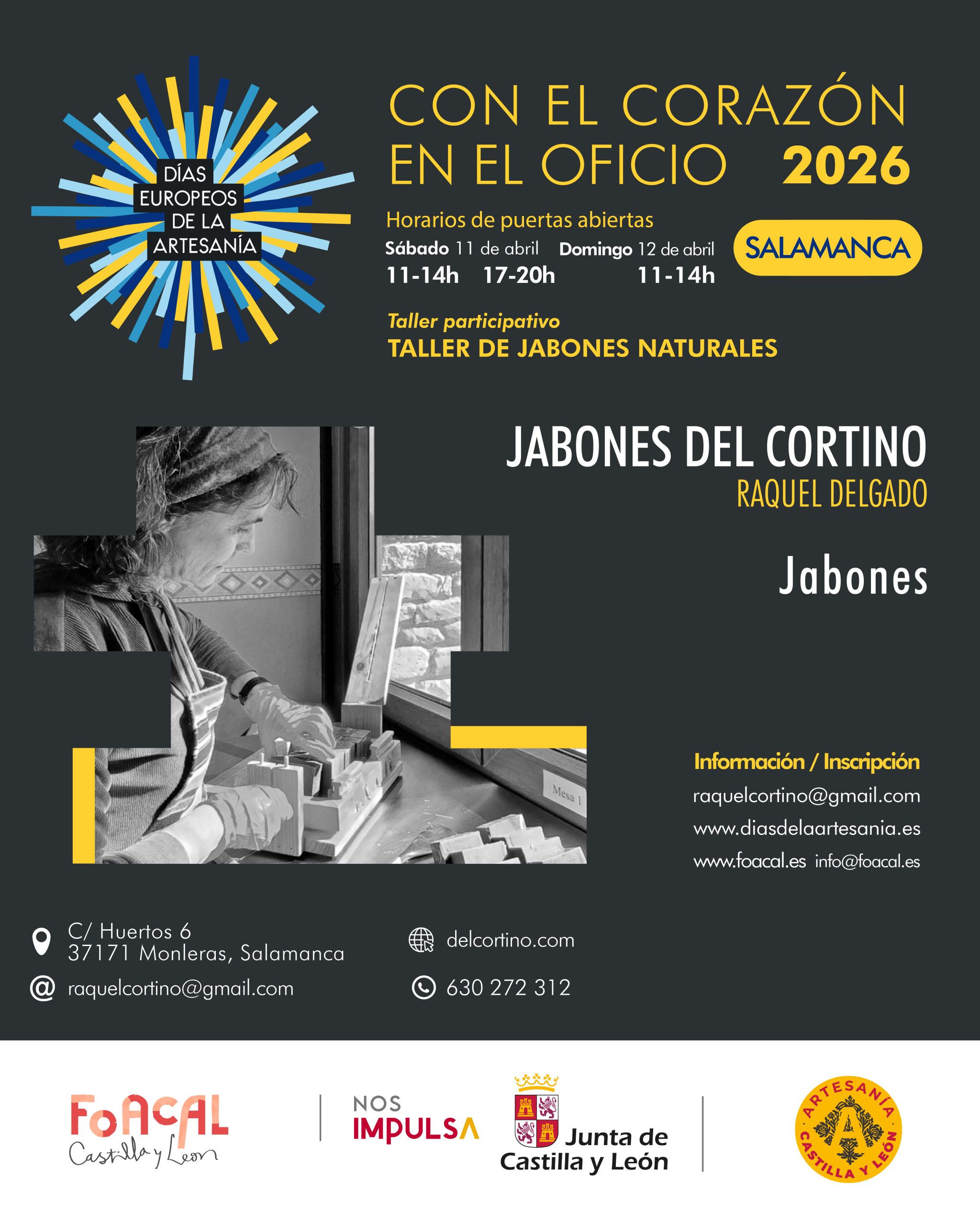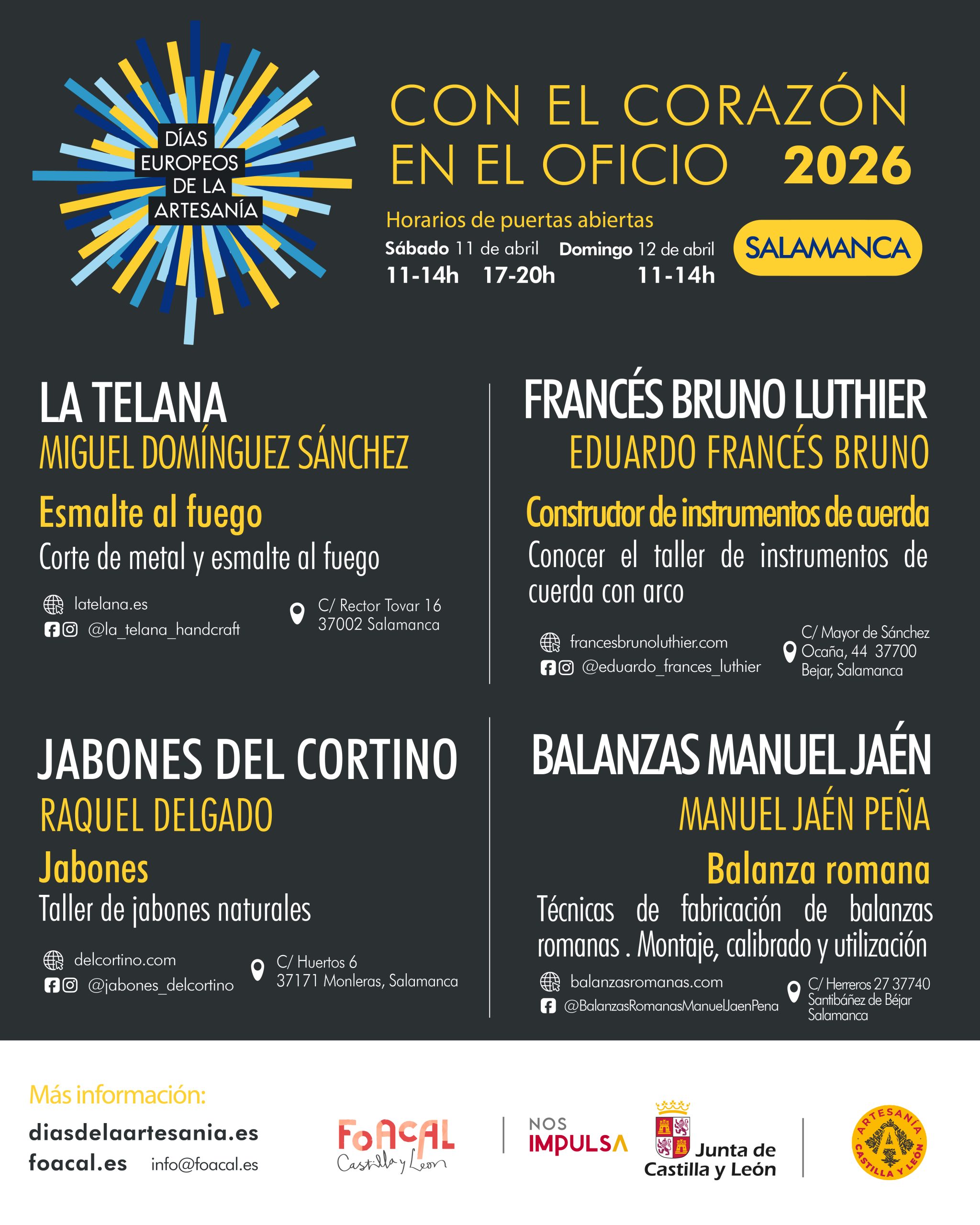 La Federación de Organizaciones Artesanas de Castilla y León (FOACAL), con el apoyo y financiación de la Junta de Castilla y León, promueve una nueva edición de los Días Europeos de la Artesanía en la provincia de Salamanca con cuatro talleres artesanos que abrirán sus puertas al público el sábado 11 y el domingo 12 de abril. La programación se enmarca en el lema «Con el corazón en el oficio» y permitirá acercarse al trabajo real de los oficios en distintos puntos del territorio salmantino.