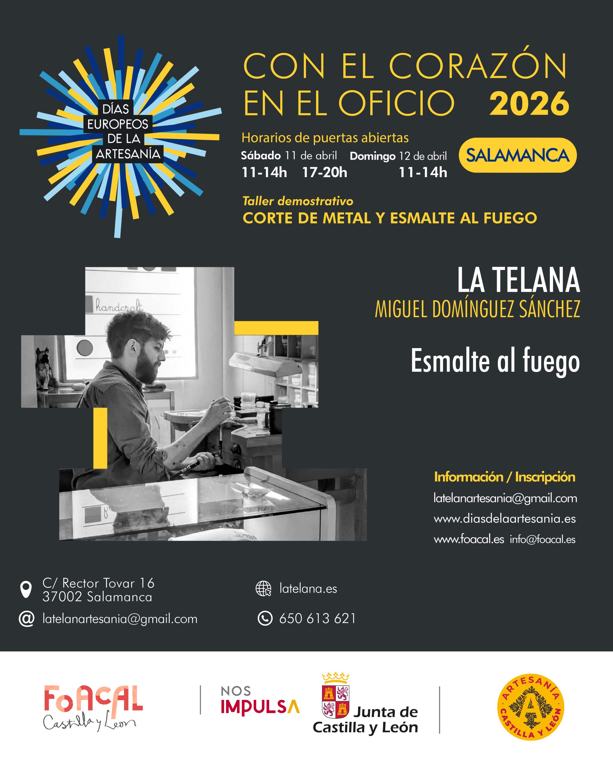 En Salamanca capital, el taller La Telana, dirigido por Miguel Domínguez Sánchez, desarrollará un taller demostrativo de corte de metal y esmalte al fuego, una propuesta que permitirá conocer de cerca un proceso artesanal en el que se combinan técnica, precisión y trabajo manual sobre metal. Las personas interesadas pueden reservar plaza en el 650 613 621.