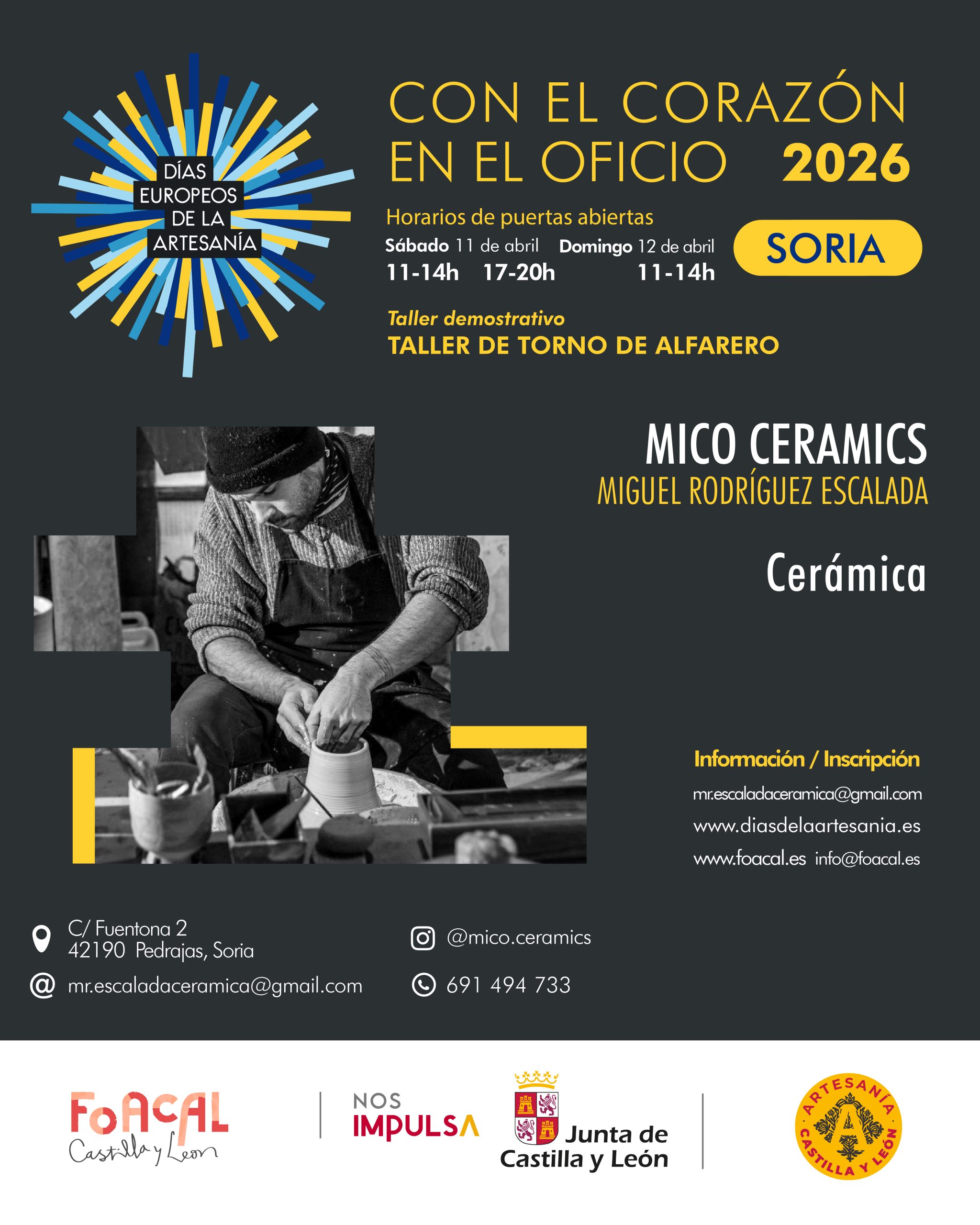 La Federación de Organizaciones Artesanas de Castilla y León (FOACAL), con el apoyo y financiación de la Junta de Castilla y León, promueve una nueva edición de los Días Europeos de la Artesanía en la provincia de Soria con cuatro talleres artesanos que abrirán sus puertas al público el sábado 11 y el domingo 12 de abril. La programación se enmarca en el lema «Con el corazón en el oficio» y permitirá acercarse al trabajo real de los oficios en distintos puntos del territorio soriano.