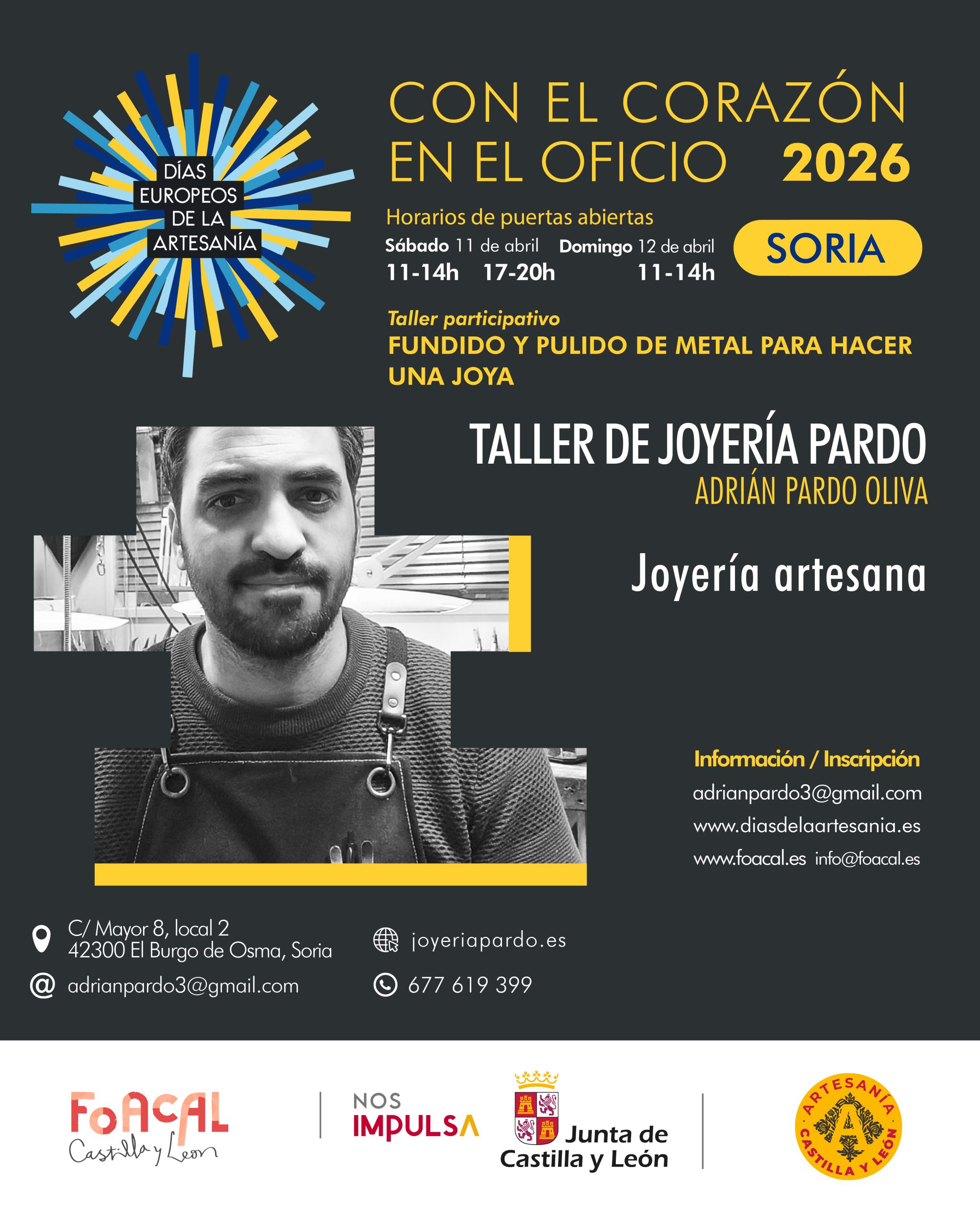 En El Burgo de Osma, el Taller de Joyería Pardo, dirigido por Adrián Pardo Oliva, ofrecerá un taller participativo de fundido y pulido de metal para hacer una joya, acercando al público a un trabajo minucioso vinculado a la transformación artesanal del metal. La inscripción puede realizarse a través del teléfono 677 619 399.