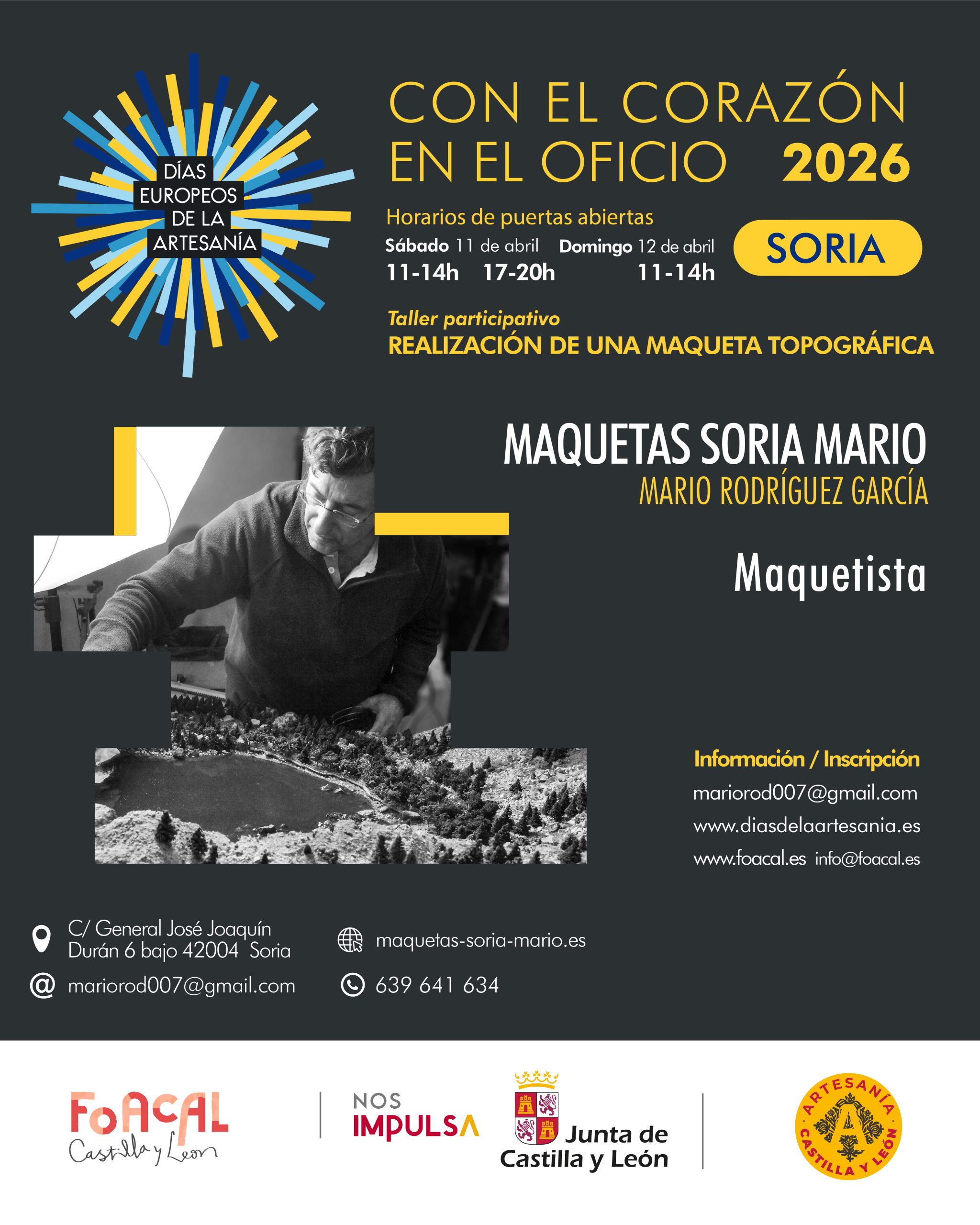 En Soria capital, Maquetas Soria Mario, dirigido por Mario Rodríguez García, impartirá un taller participativo de realización de una maqueta topográfica, una actividad que permitirá descubrir el trabajo detallado de representación del relieve y la construcción a escala. Las reservas pueden gestionarse en el 639 641 634.