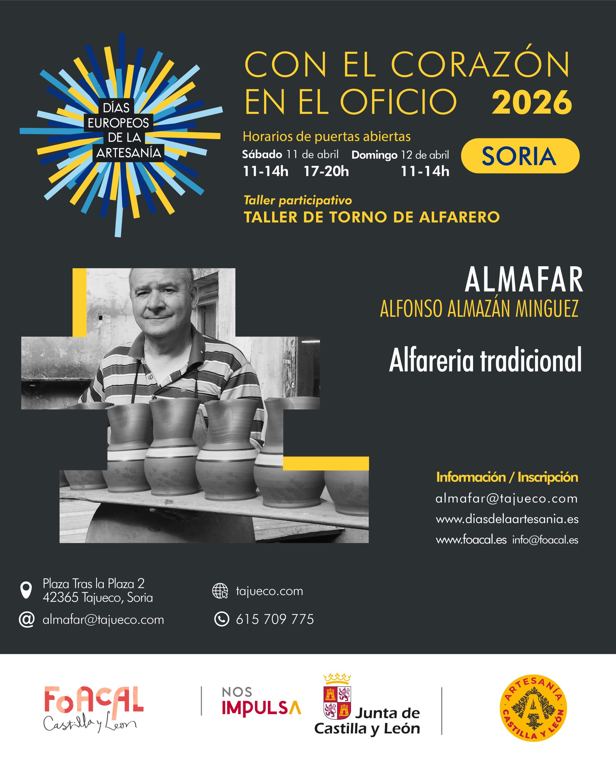 Por su parte, en Tajueco, el taller Almafar, dirigido por Alfonso Almazán Mínguez, desarrollará un taller participativo de torno de alfarero, una propuesta vinculada a la alfarería tradicional y a un oficio con fuerte arraigo en esta localidad soriana. Quienes deseen participar pueden inscribirse en el 615 709 775.