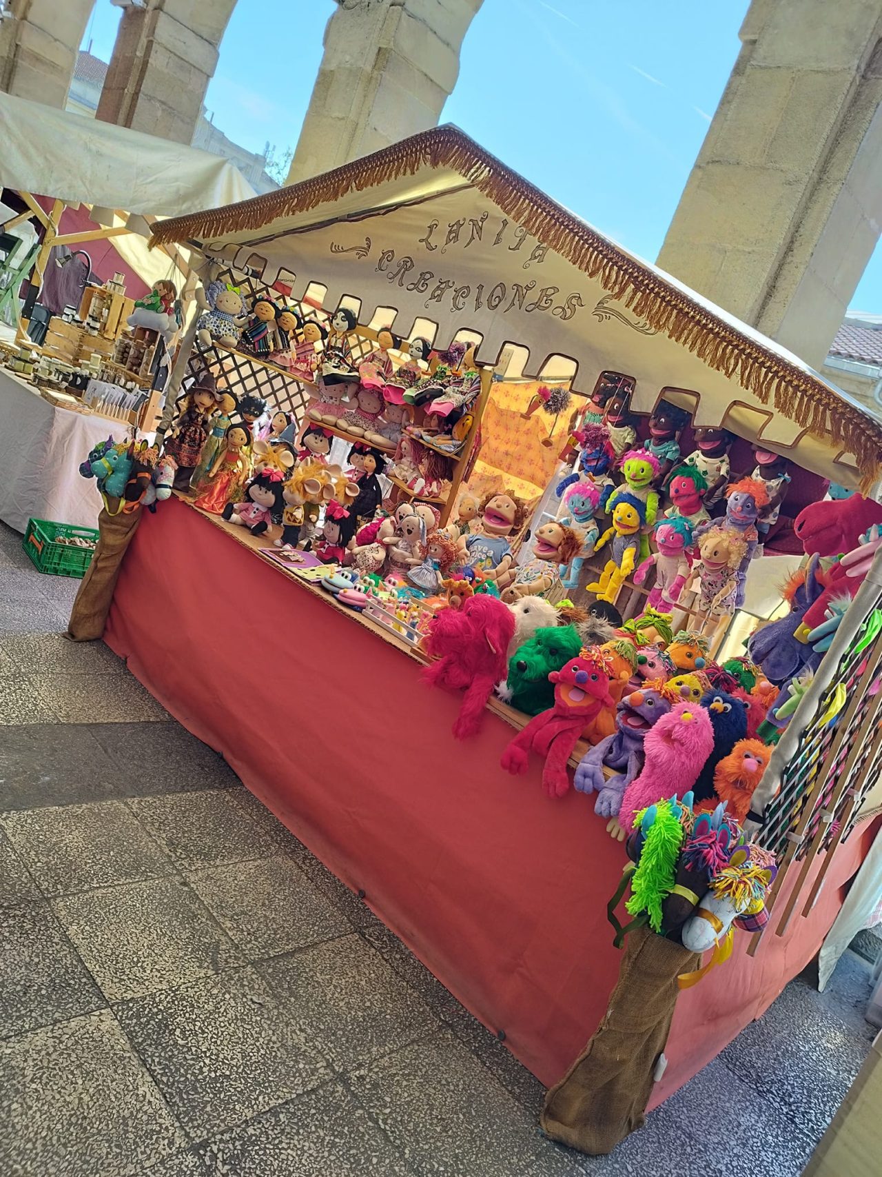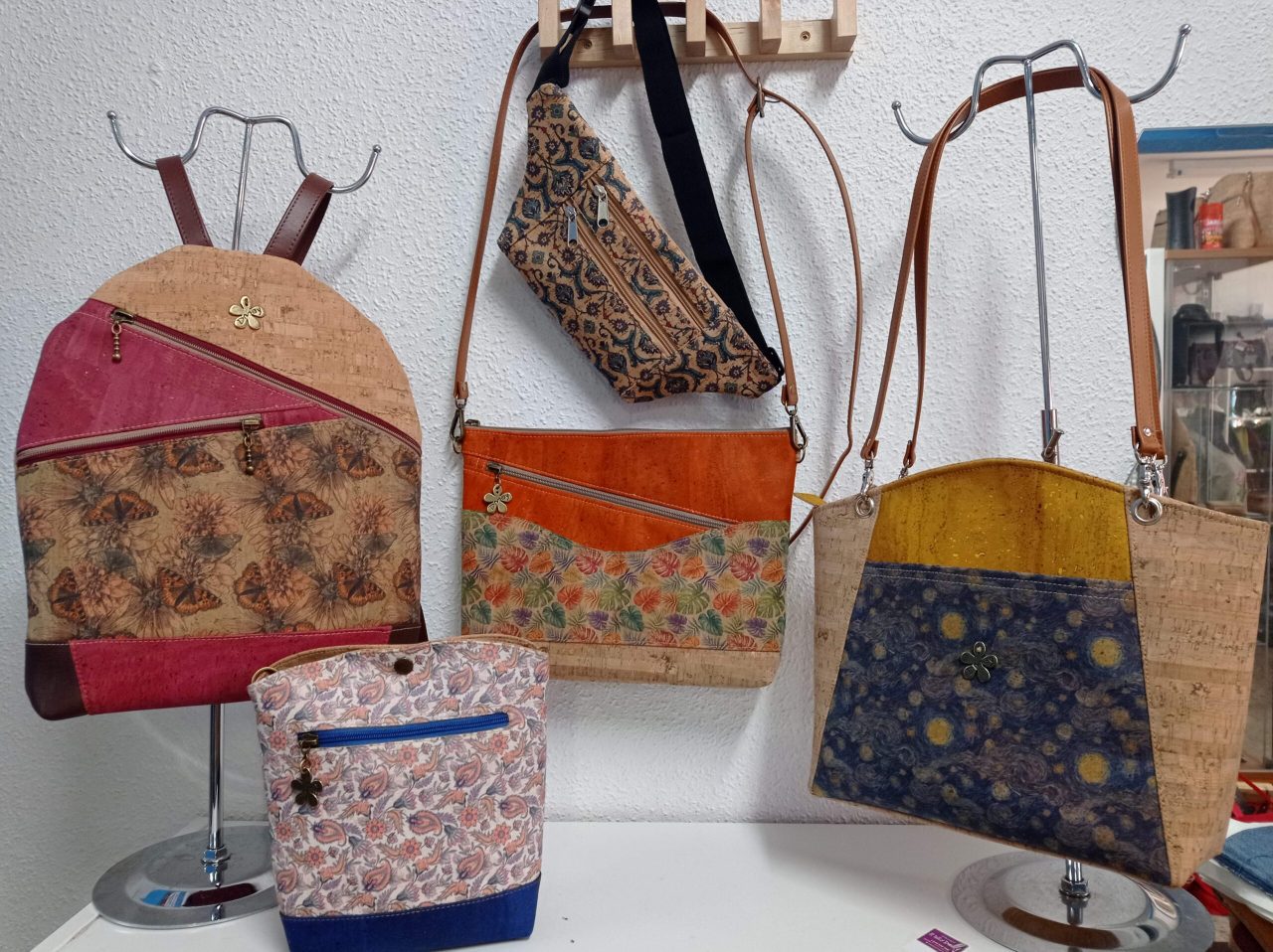 Complementos hechos a mano, paraguas y camisetas pintadas y bolsos artesanos.