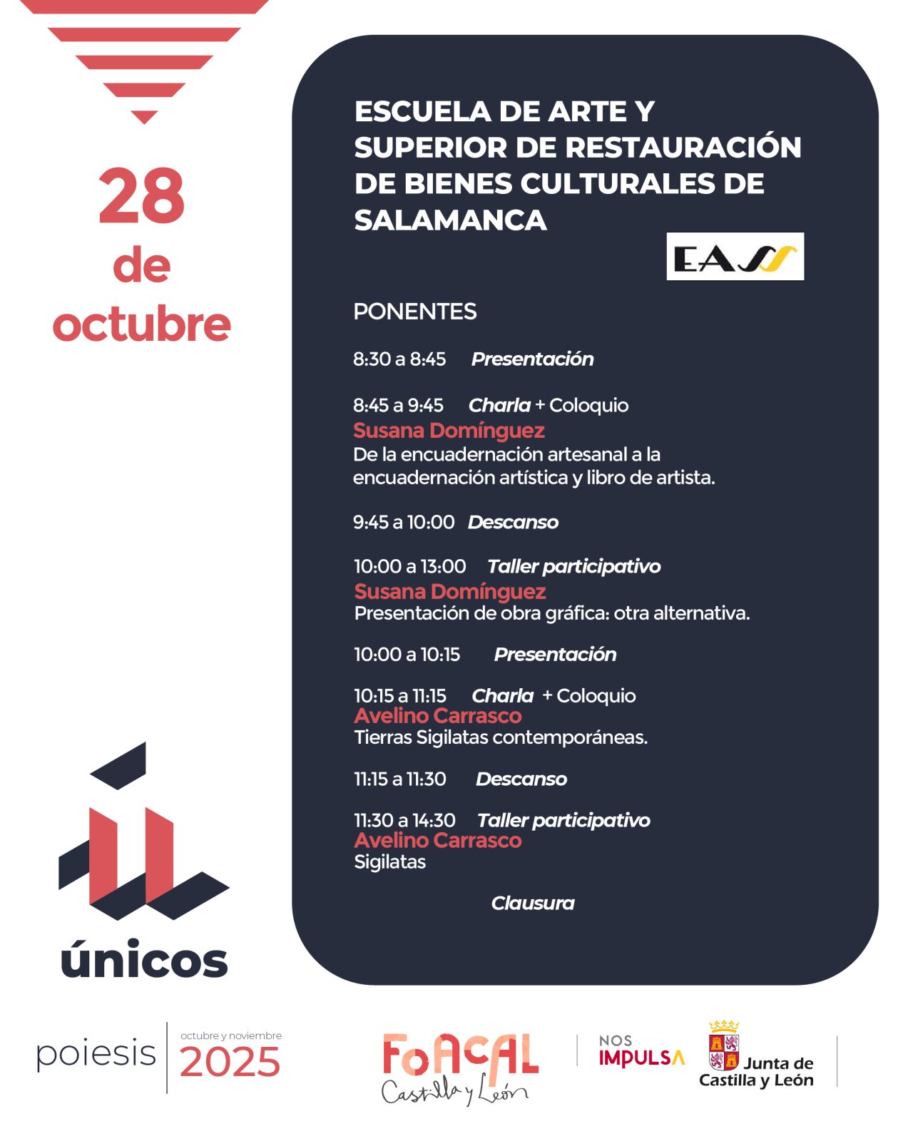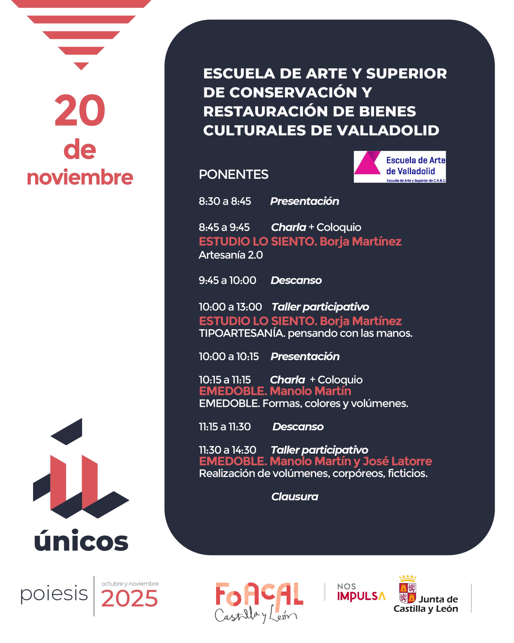 ÚNICOS se presenta en un formato presencial en todas las Escuelas de Arte de Castilla y León junto a la difusión en directo online, hecho que permiten la conexión de los estudiantes de otras escuelas y público interesado. Además, las intervenciones, se graban, previa autorización del ponente, y pasan a integrar el repositorio abierto en el canal de YouTube de FOACAL