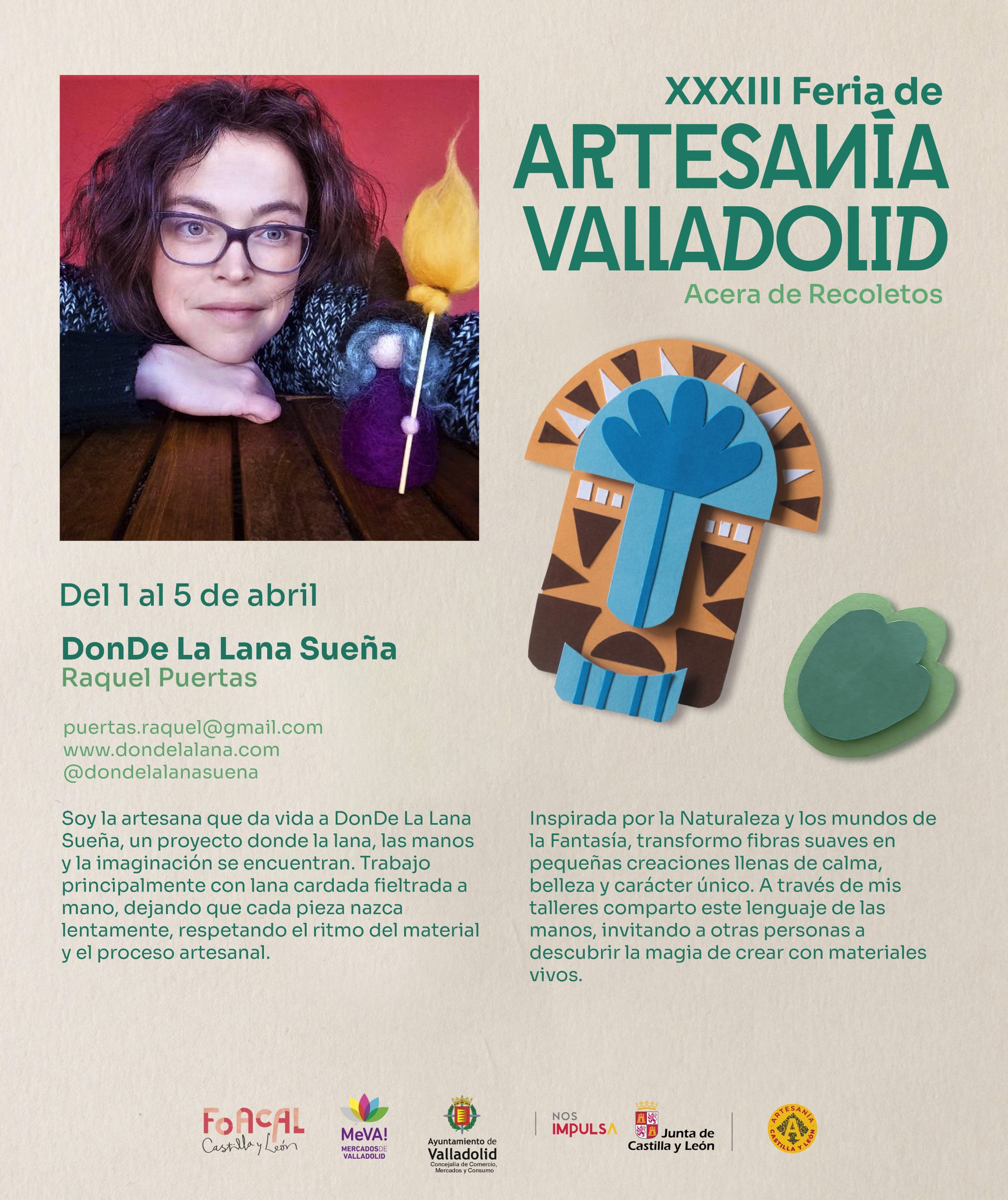 - La feria, organizada por la Federación de Organizaciones Artesanas de Castilla y León (FOACAL) con el apoyo del Ayuntamiento de Valladolid y la Junta de Castilla y León, abre todos los días en horario amplio de mañana y tarde (11:00–14:30 y 17:00–21:30)