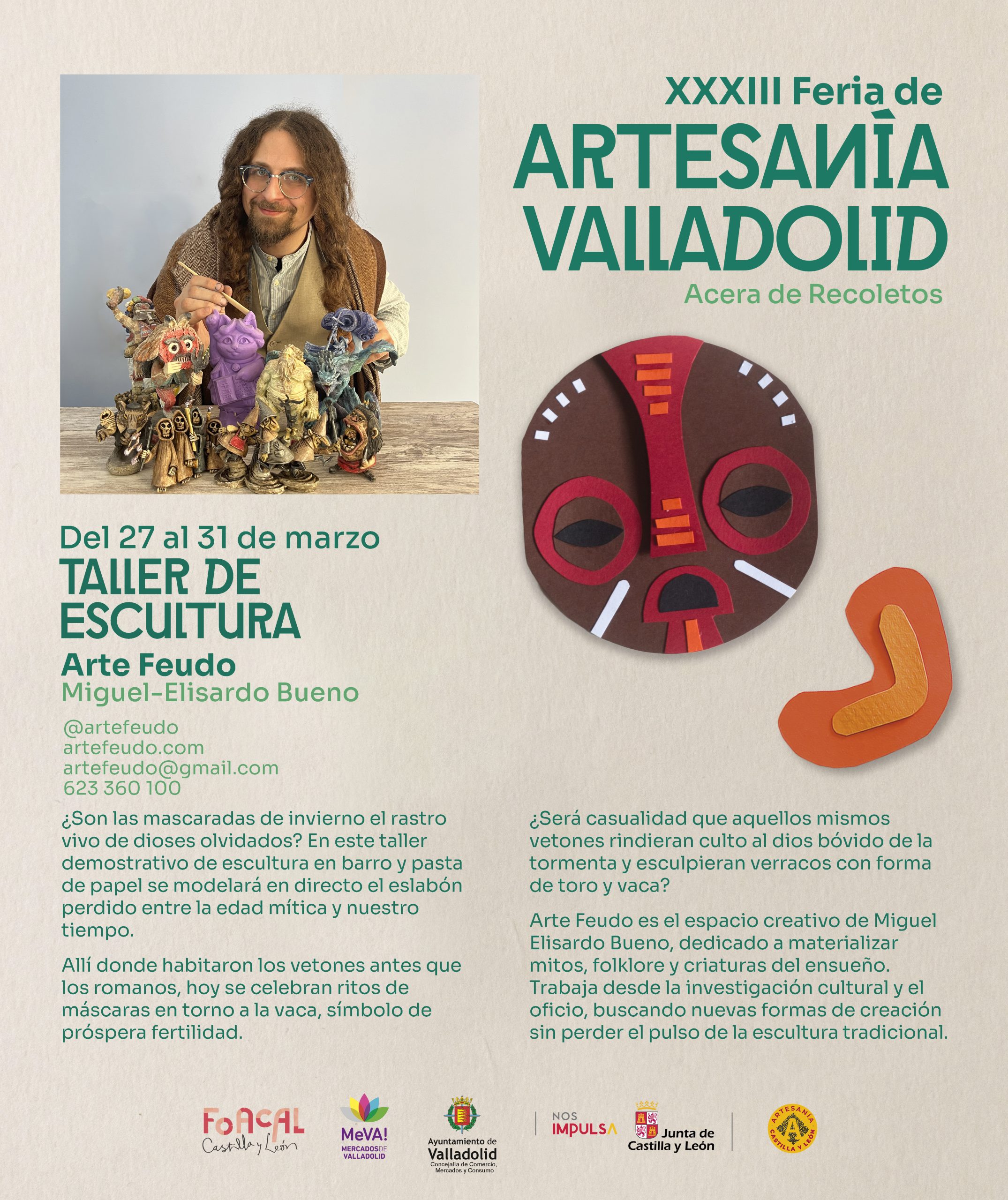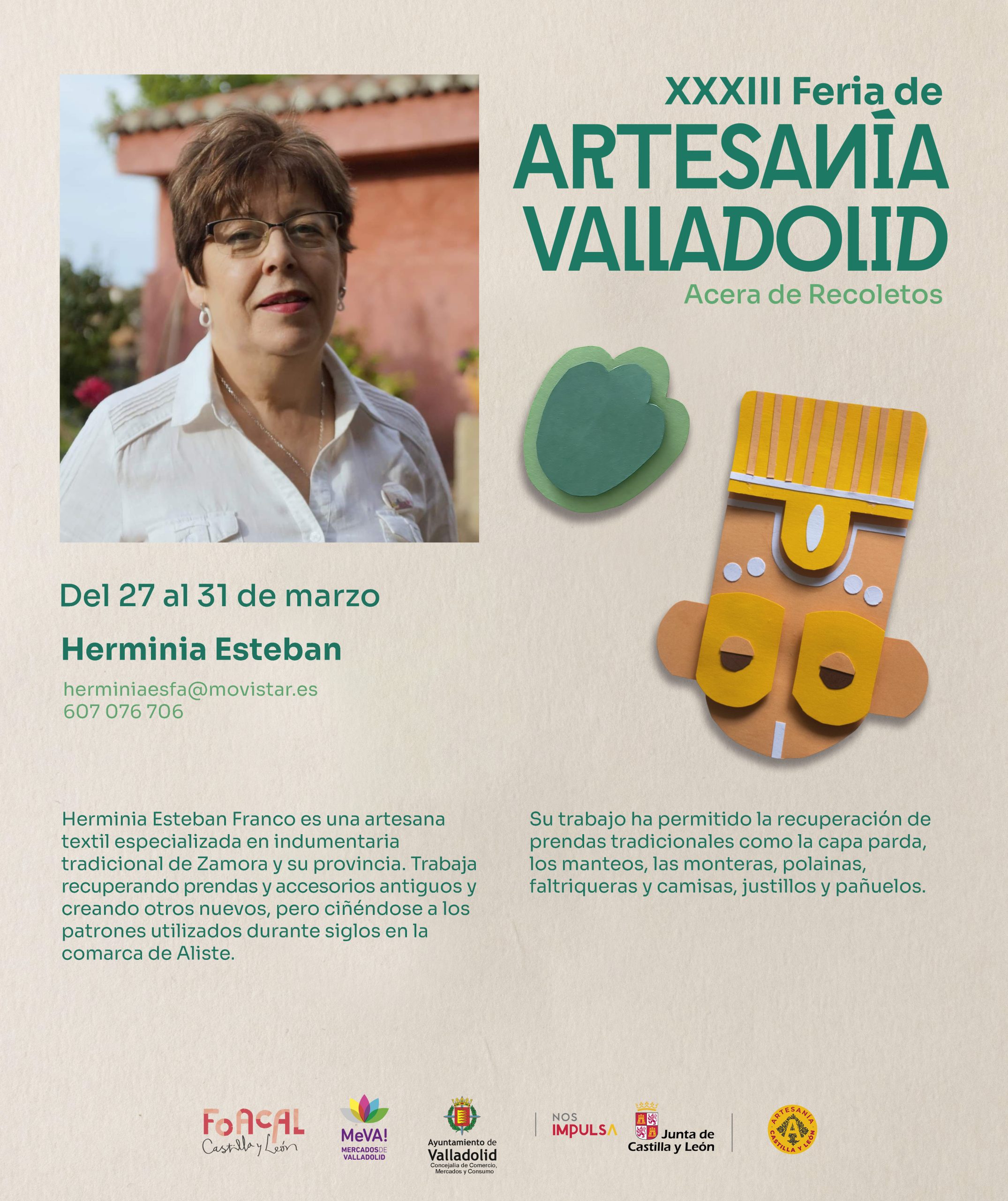 - La XXXIII Feria de Artesanía de Valladolid se celebrará del 27 de marzo al 5 de abril en la Acera de Recoletos, con 34 talleres artesanos y una programación especial dedicada a indumentaria y máscaras vinculadas al patrimonio festivo popular