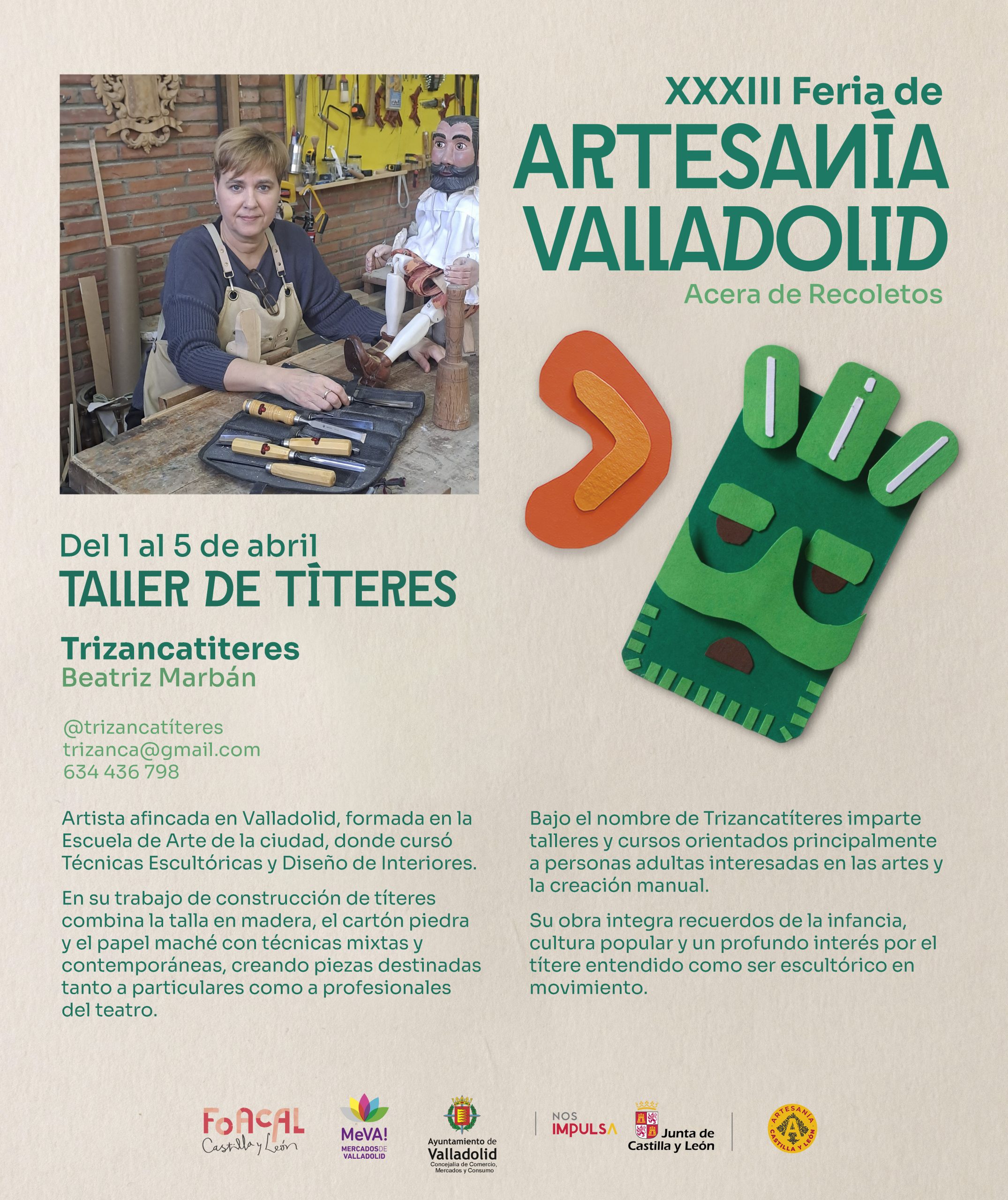 La XXXIII Feria de Artesanía de Valladolid se celebrará del 27 de marzo al 5 de abril en la Acera de Recoletos, con entrada libre y apertura diaria en doble franja: de 11:00 a 14:30 y de 17:00 a 21:30 horas. Organizada por la Federación de Organizaciones Artesanas de Castilla y León (FOACAL) en colaboración con el Ayuntamiento de Valladolid y la Junta de Castilla y León, la cita reunirá a 34 talleres artesanos e incorporará, como novedad, cuatro talleres demostrativos vinculados a las mascaradas tradicionales.